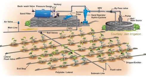 滴灌系統(tǒng)采用管道輸水,壓力可調(diào),不受地形限制。